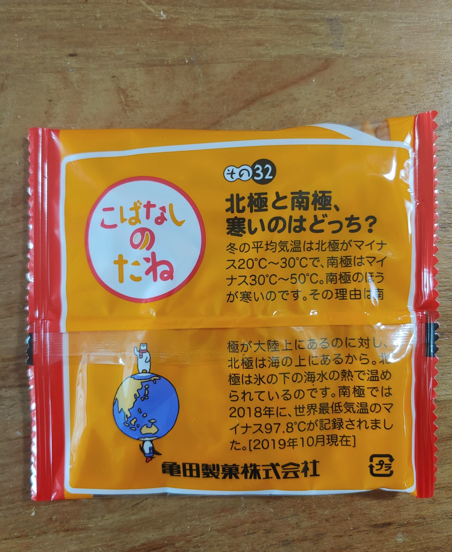 개별포장 뒷면에는 그냥 상식퀴즈 같은 게 적혀있는 것 같다. 북극과 남극 중 어느곳이 더 추울까? 북극의 겨울평균은 마이너스 20~30, 남극은 마이너스 30~50도라고. (북극 평균이 이렇게 높다고??)