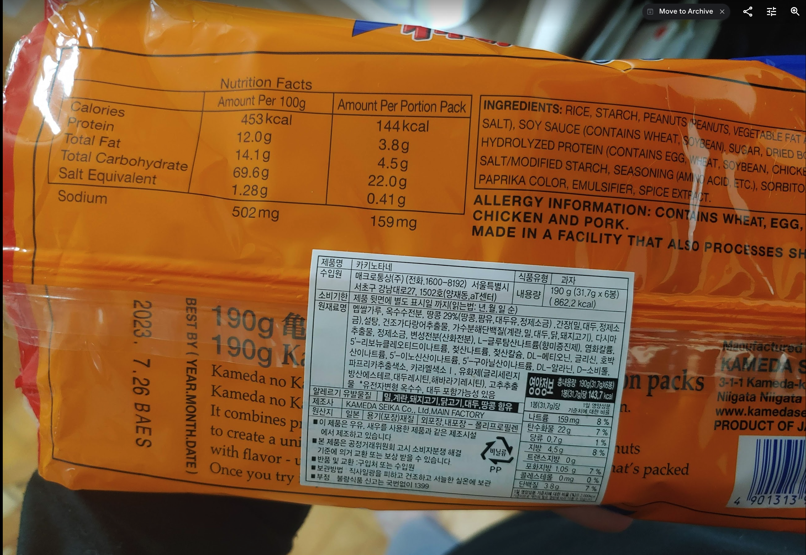 영양성분표도 한 번 보자. 나트륨, 탄수화물, 단백질, 지방이 완벽하게 조화를 이루고 있다. (땅콩이 함께 들어있는 버전이므로, 땅콩을 빼고 먹는다면 지방이나 단백질이 좀 모자란 탄수화물 중심의 과자로 짐작할 수 있다.)