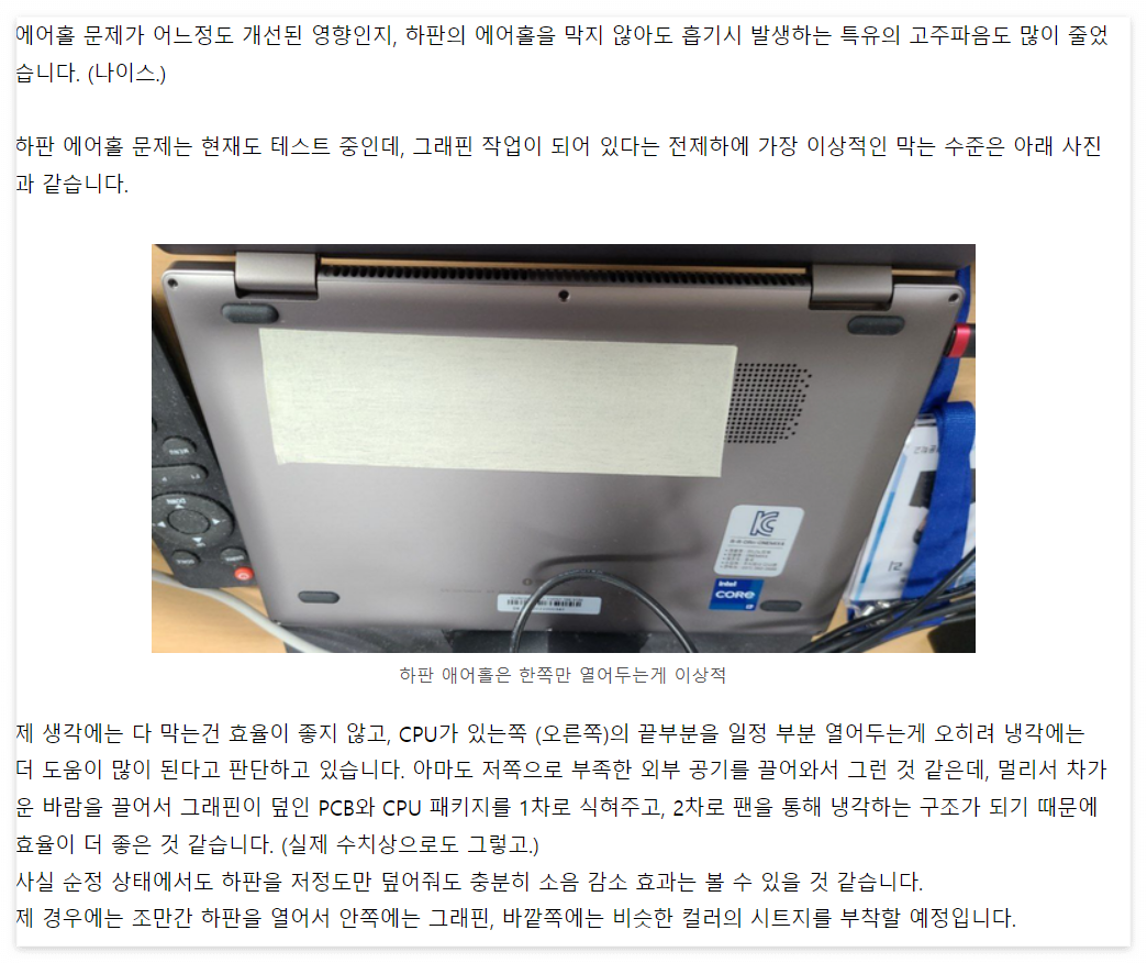 가장 쉽고 재밌는 팁 (출처는 위의 카페에 올라온 글 : 손바닥으로 하판 흡기구를 막아보면 소음이 극적으로 줄어든다)