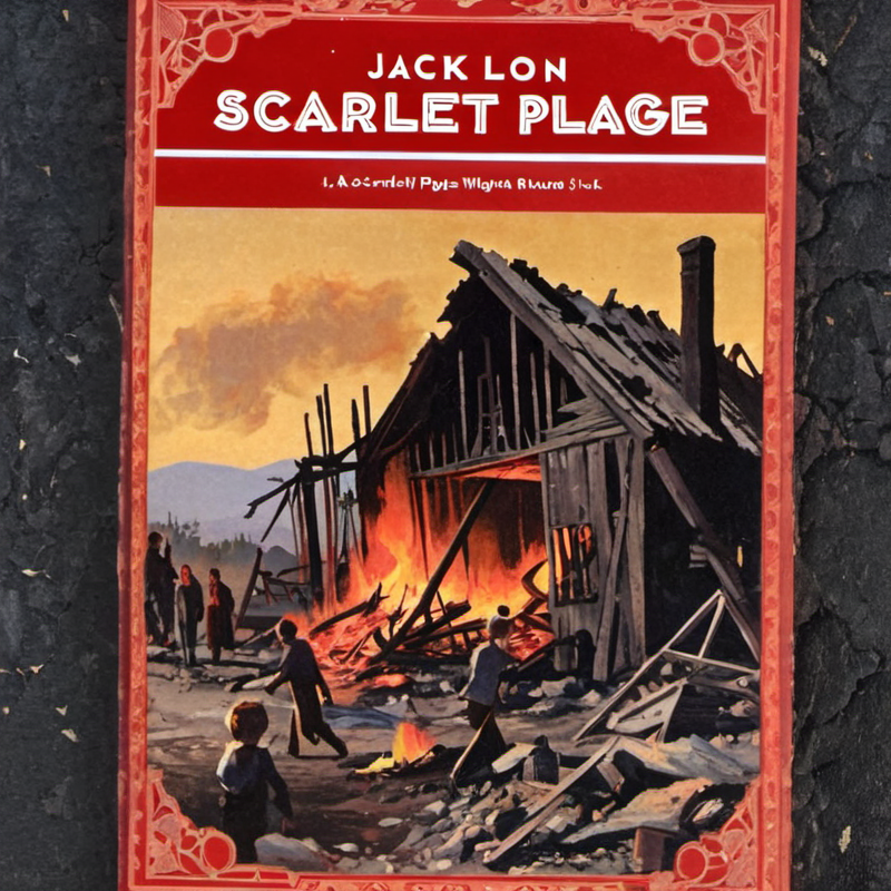긍정: Book cover of a vintage post apocalypse novel called "Scarlet Plague" written by "Jack London", depicting a family in a ruined village, bon fire, building frames