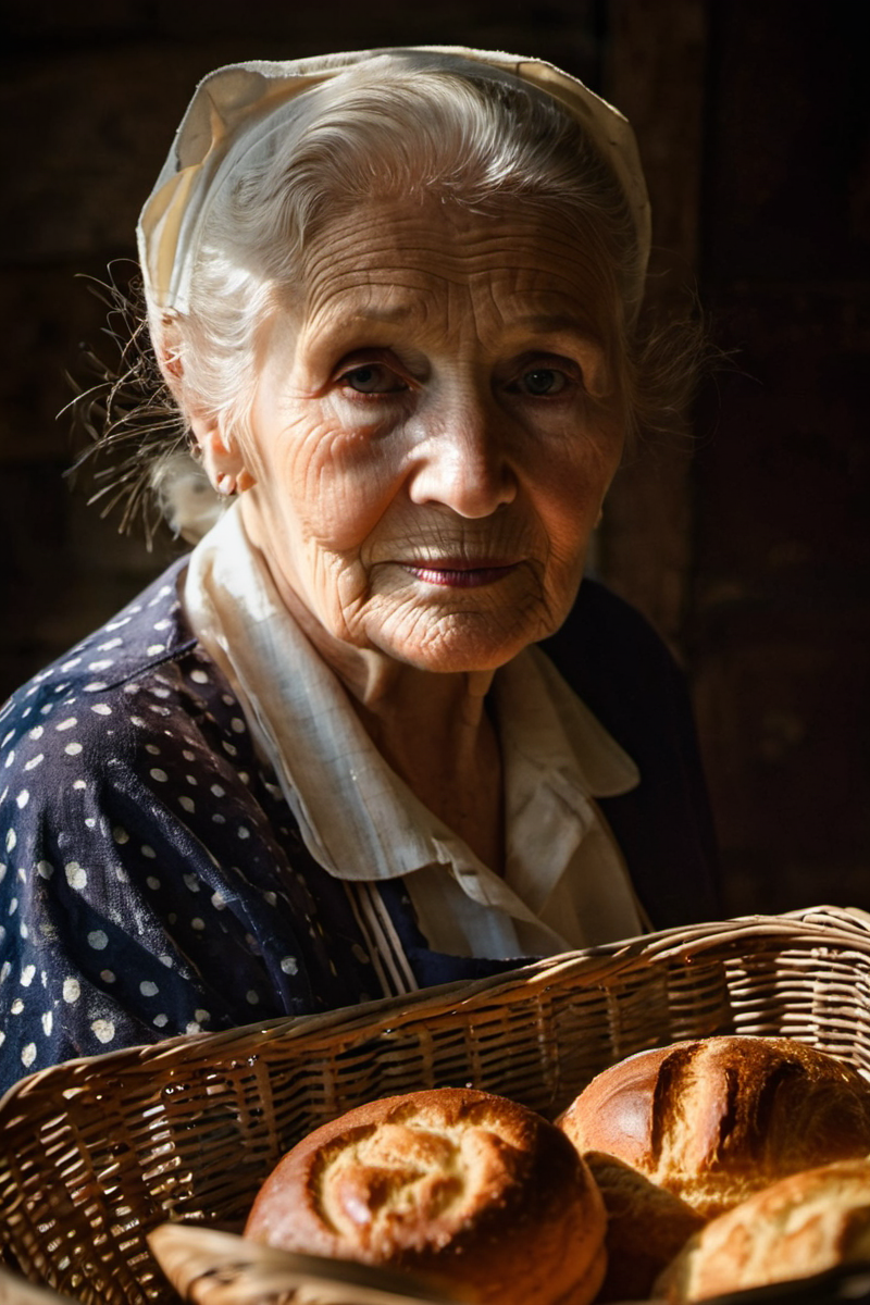 Old lady, photograph, portrait, face, Butter bakery basket, Lunatic_Portrait photo, dim light, rim light, soft shadows, (dramatic backlighting:1.5)