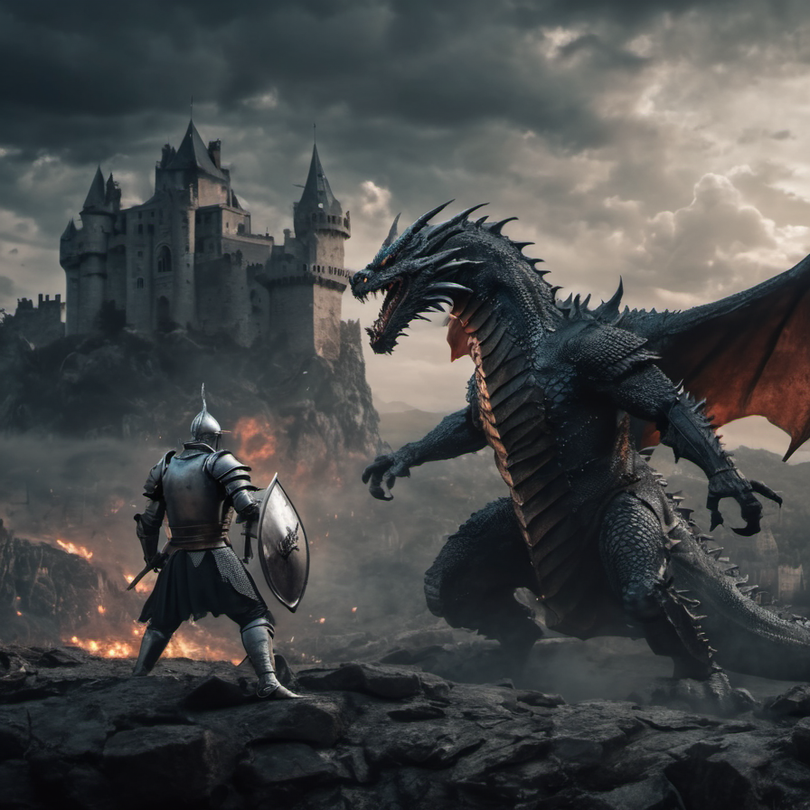 battle scene with 1 medival knight against flying giant dragon, a castle in the background., masterpiece, 8K, dark art
