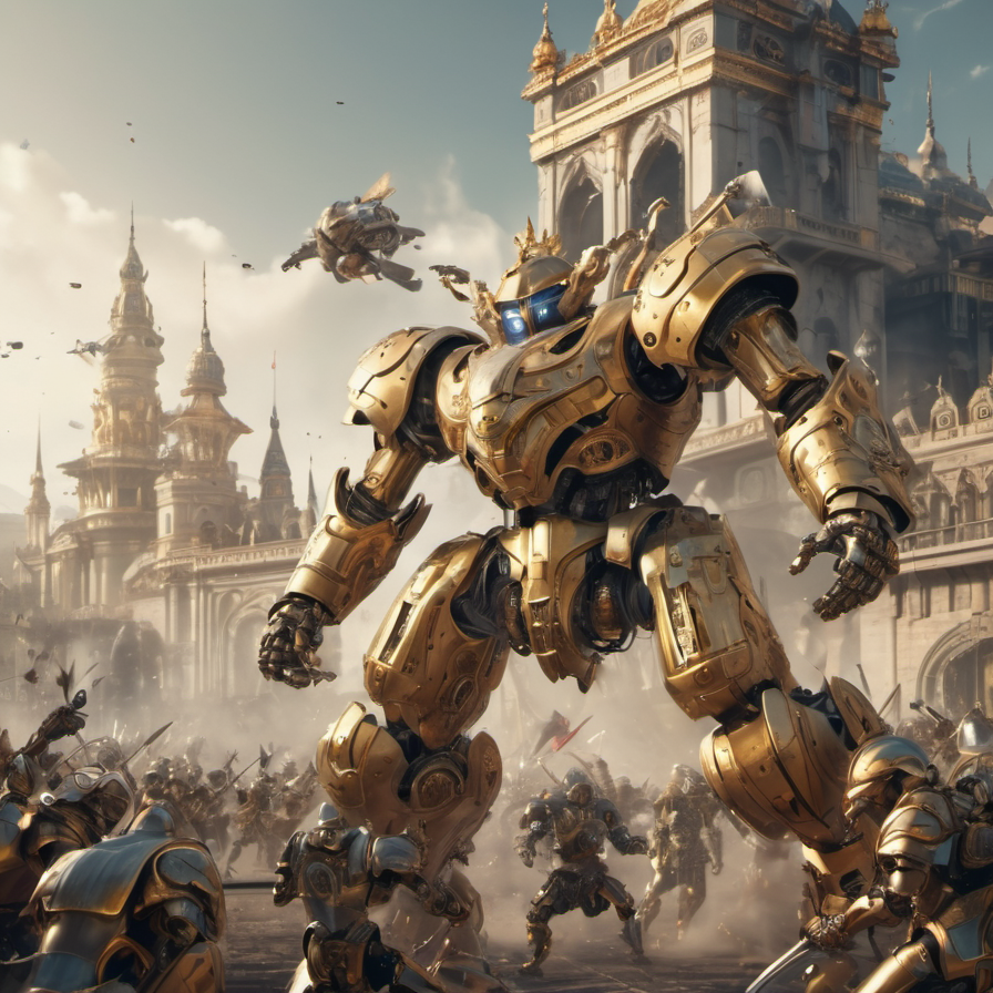 “Baroque-style battle scene with futuristic giant robots against medival knights and a golden palace in the background.”, masterpiece, 8K