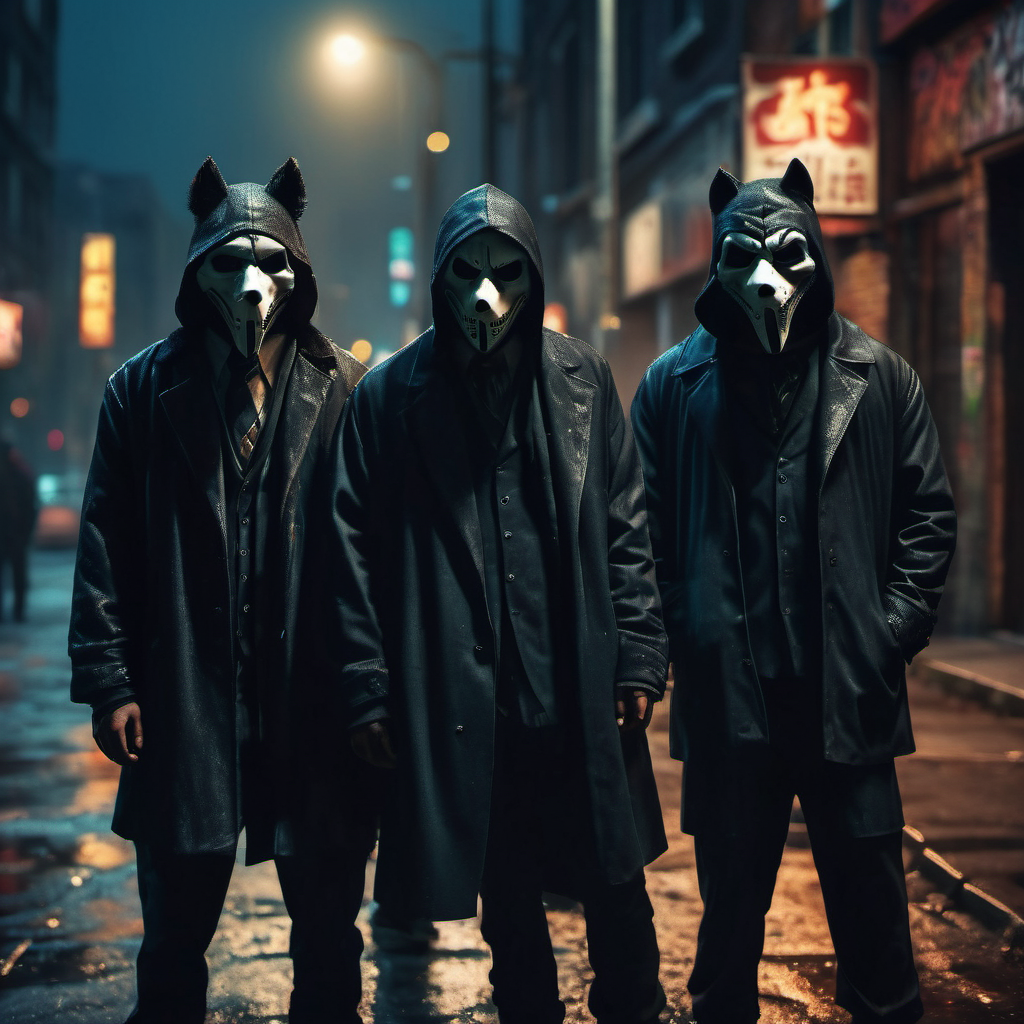 animal head gangsters standing on a street corner, grafiti, dynamic lighting, photorealistic dark fantasy concept art, ultra detailed, ultra realistic, super realistic, photograph, RAW, trending on art station, stunning visuals, creative, cinematic, ultra detailed, scary art, bokeh, cinemascope, moody, epic, gorgeous, Eerie, unsettling, dark, spooky, suspenseful, grim, highly detailed