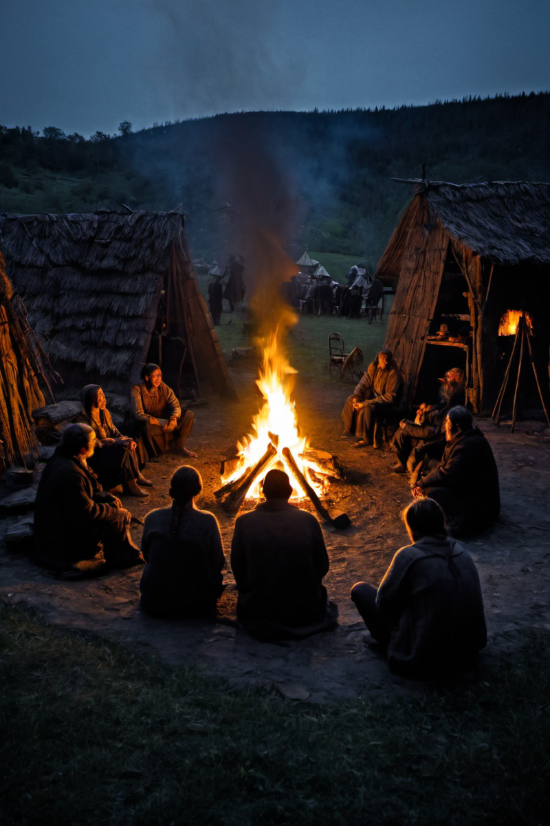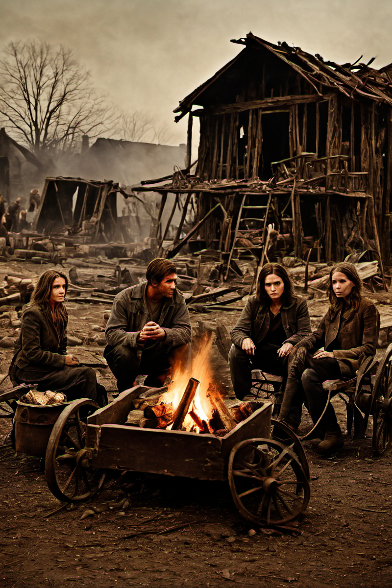 긍정 : post apocalypse, bookcover, primitive clothed family, sitting around a bon fire, primitive building frames, broken wagon, dark village, (super realistic, detailed, dark, gloomy), <lora:JuggerCineXL2:1.5>, (creative, cinematic, ultra detailed, scary art, photograph),