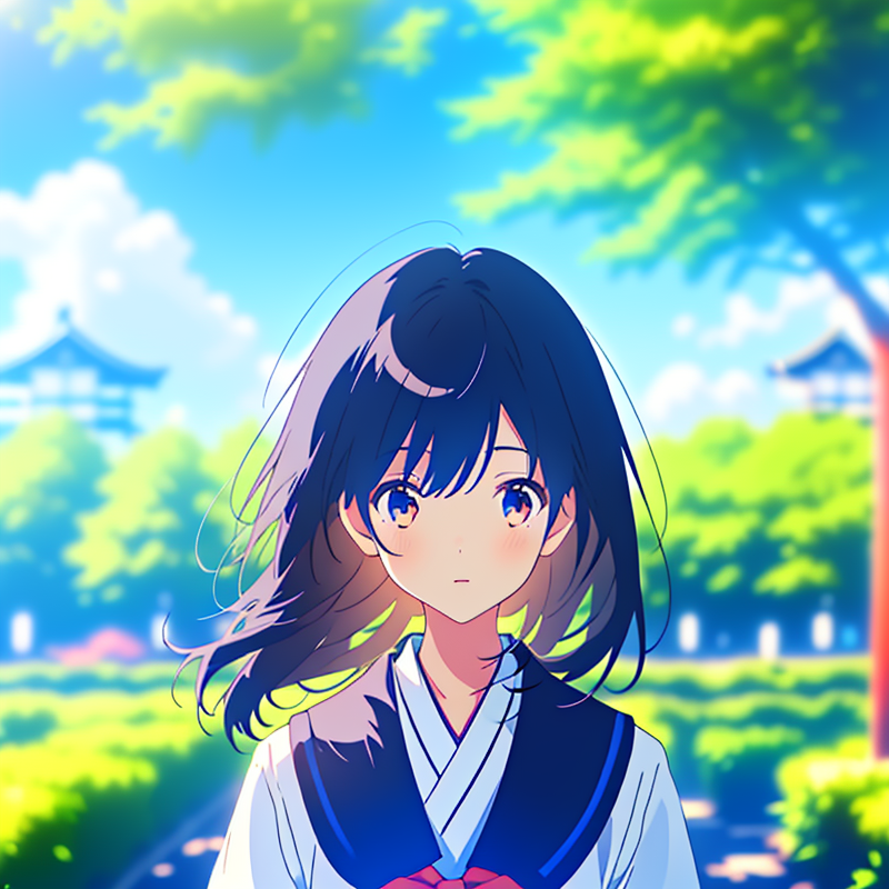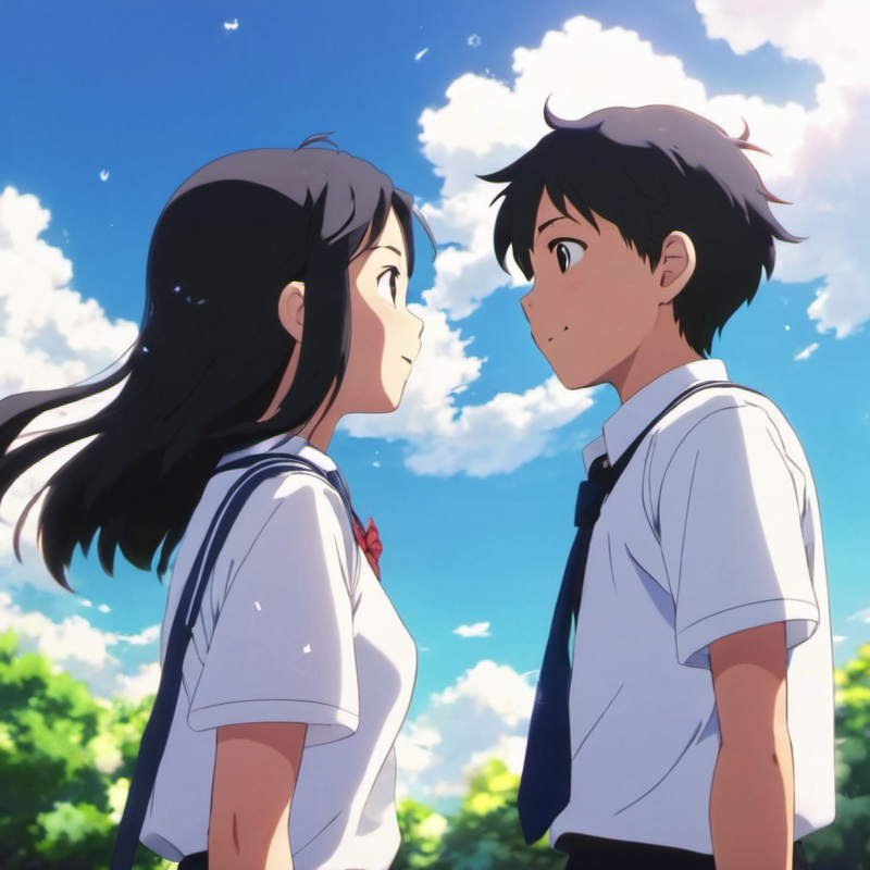 1girl 1boy facing each other, flower, outdoors, school uniform, day, sky, cloud, black hair, sunlight, white shirt, school uniform, upper body, blurry, (masterpiece, best quality), depth of field, japanese animation, 2D