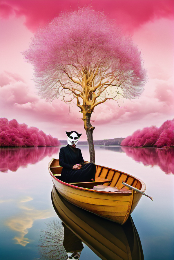 golden tree, pink planet, Surrealism, masterpiece.up portrait of diverse model couple with man bright white face, and women dark black face with red eyes looking straight at you in a boat on a mirror lake by hyeronimus bosch.More surrealism and madness.much more surrealism and crazy designs. With gold and cardinal red surreal Salvador Dali clouds coming out of her head.more surrealism and bizarre designs with bright vibrant colours.
