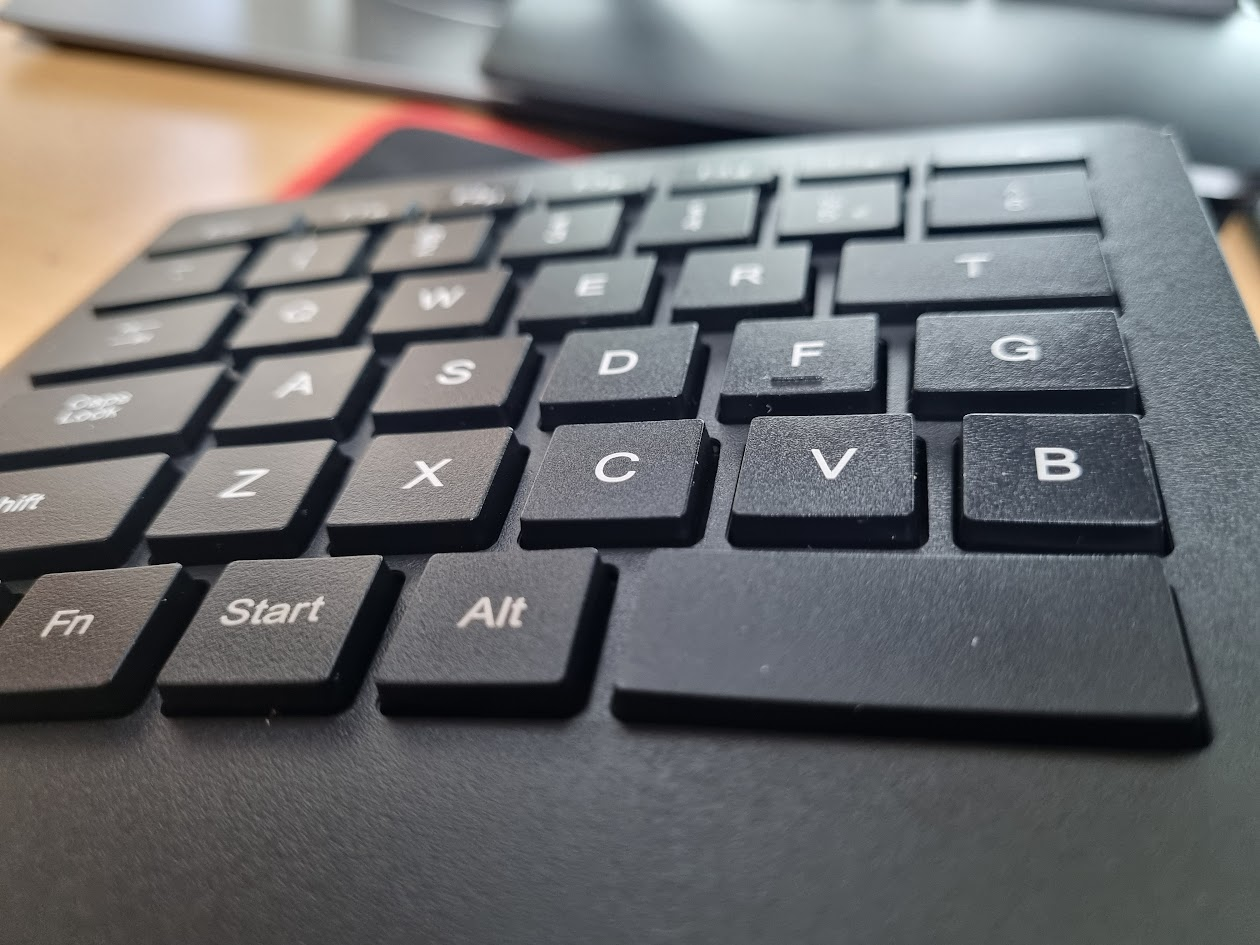 지금 이 리뷰를 이 키보드로 쓰고 있다. 처음 쓰기 시작할 때부터 지금까지 계속 제일 불편한 건 한글 각인이 없다는 것이다. 키보드를 안 보고 친 지 20년이 넘고, 묵각도 큰 지장이 없다. (기호만 빼면 ㅠ) 그런데 분리형 키보드는 각인이 없으면 좀 어렵다. 손가락을 계속 올려놓은 상태에서는 괜찮지만, 한 번 손을 뗏다가 다시 올리면 제 자리를 찾기가 쉽진 않다. 그래서였나 키네시스에도 한글 각인이 있는 키캡으로 갈아끼워뒀었네.