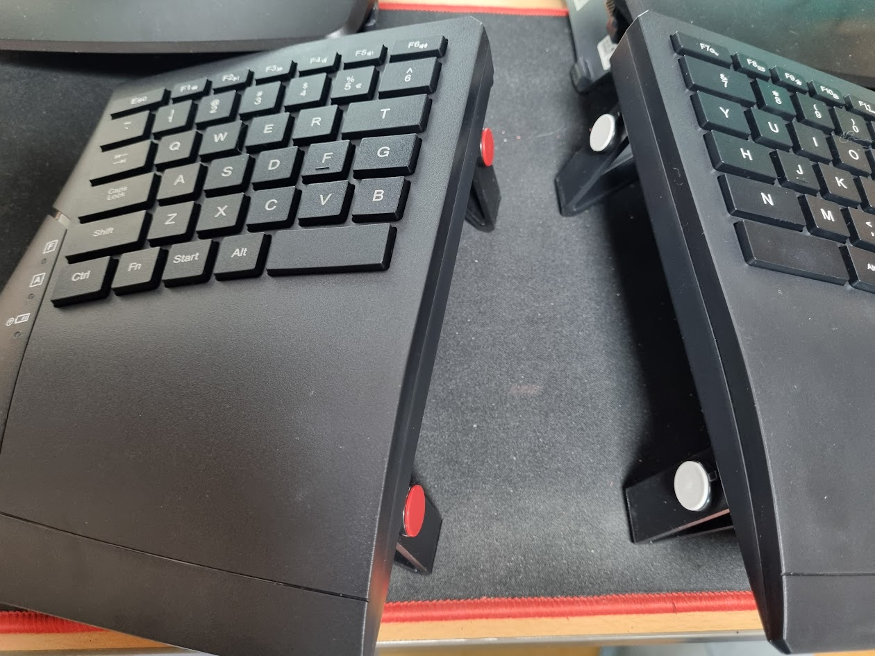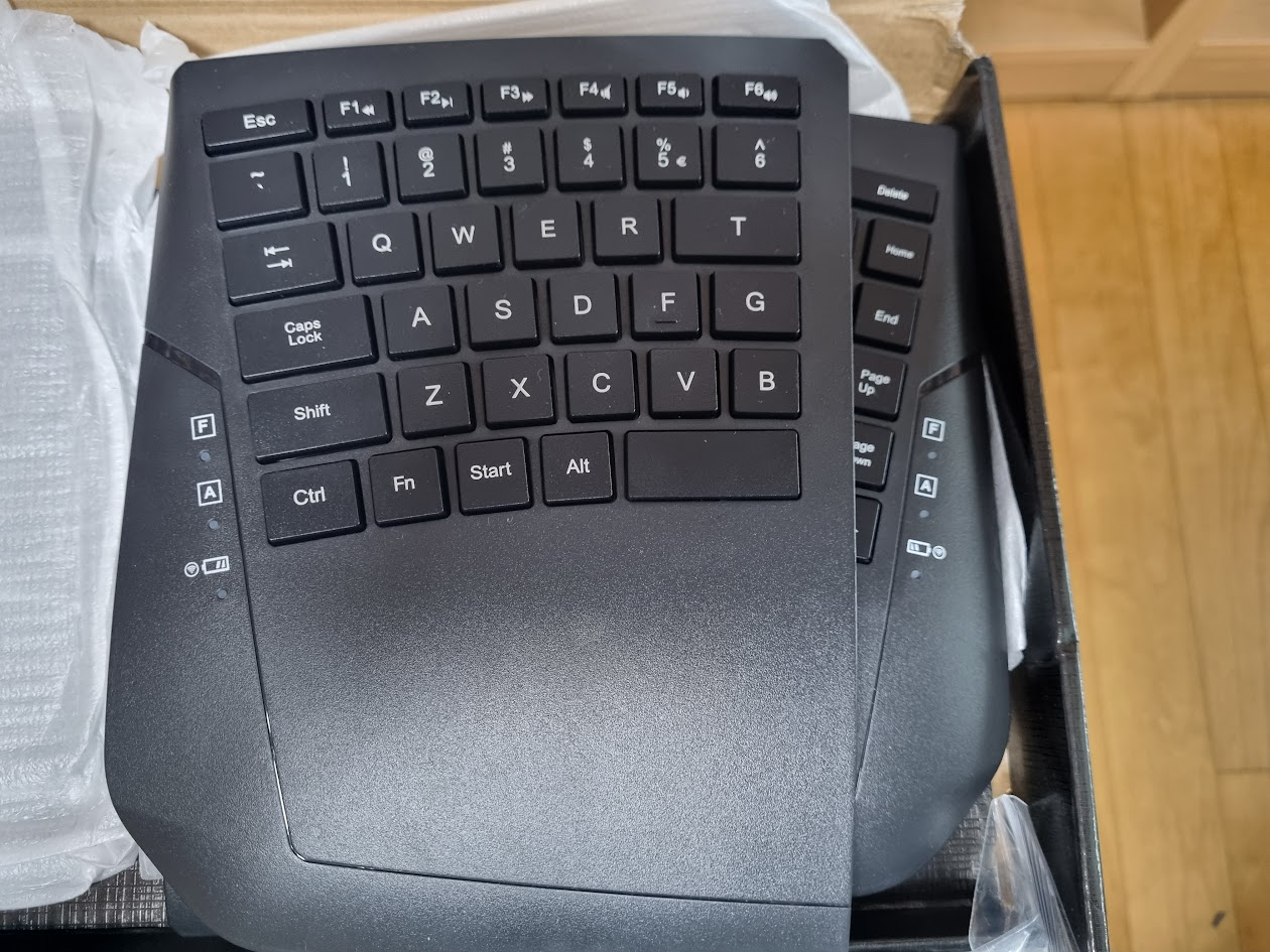 오른쪽 유닛을 키네시스와 크기 비교해봤다. 폭도 작고 길이도 작고 두께도 얇다. 전체적으로 다 작은데, 덧붙여서 키캡 크기도 사알짝 작은 느낌이다.