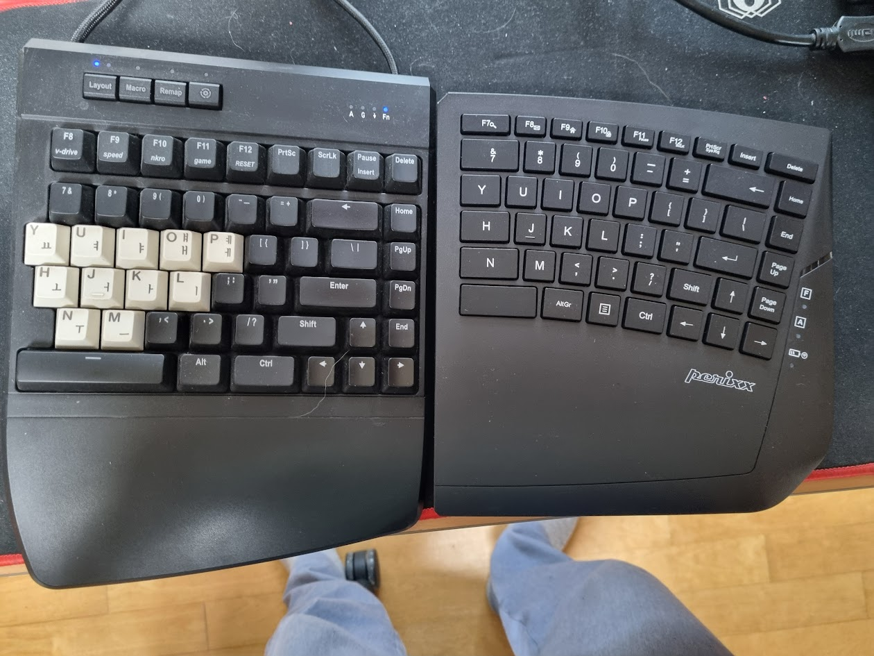 지금 이 리뷰를 이 키보드로 쓰고 있다. 처음 쓰기 시작할 때부터 지금까지 계속 제일 불편한 건 한글 각인이 없다는 것이다. 키보드를 안 보고 친 지 20년이 넘고, 묵각도 큰 지장이 없다. (기호만 빼면 ㅠ) 그런데 분리형 키보드는 각인이 없으면 좀 어렵다. 손가락을 계속 올려놓은 상태에서는 괜찮지만, 한 번 손을 뗏다가 다시 올리면 제 자리를 찾기가 쉽진 않다. 그래서였나 키네시스에도 한글 각인이 있는 키캡으로 갈아끼워뒀었네.