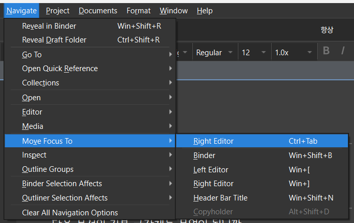 바인더와 에디터를 이동하는 단축키는 Win + Alt + E --> Ctrl + Tab 으로 변경해두고 사용 중
