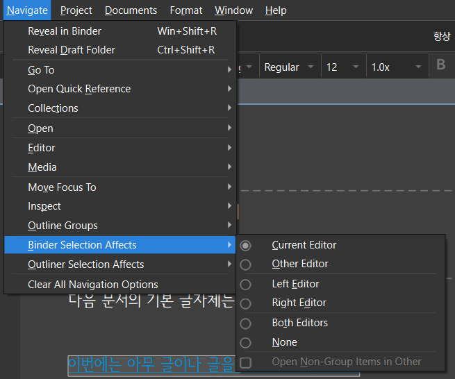기본값은 Current Editor. 오른쪽 창을 참고용 창으로 쓰려면 Left Editor로 바꿔두는 게 좋다.