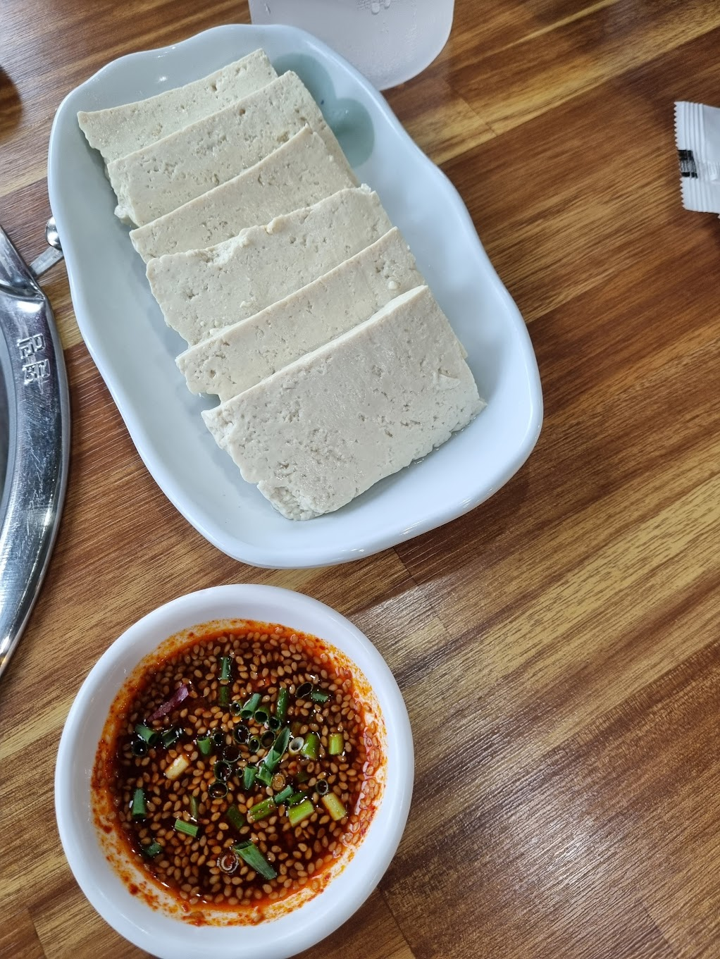 잣두부는 두부 굳힐 때 잣 부스러기를 좀 섞은 건데, 생각보다 잣향이 강하기도 했지만, 잣이 맛있다기보다는 갓 만든 몽글몽글한 손두부라 맛있었던 것 같다. 한 접시 칠천원을 두 번 시켜먹음