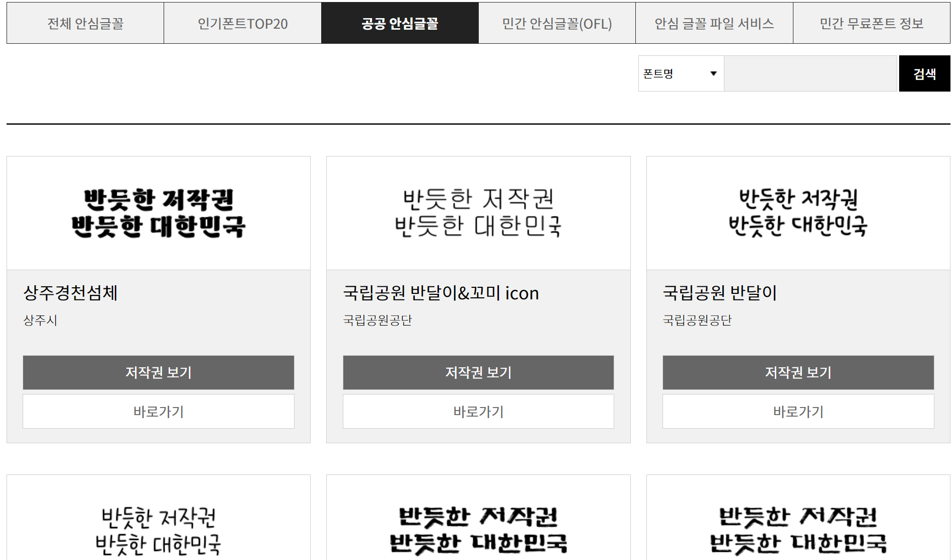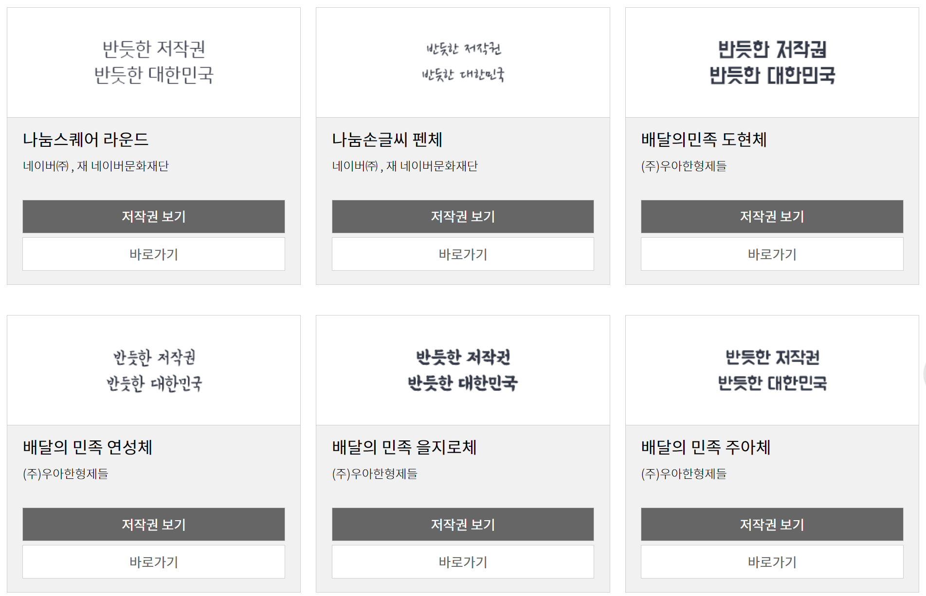 자치단체 이외에 공공기관이나 민간기업에서 만든 폰트로 모두 나열되어 있다. (배달의민족폰트, 네이버폰트 등도 포함)