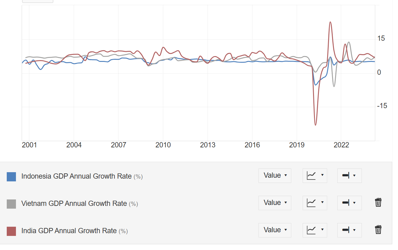 베트남, 인도네시아, 인디아의 경제 성장률은 지난 20여년 간 큰 부침이 없다. 금융위기 후 기저효과에 의한 피크 몇 번을 제외하면 추세적인 상승 또는 추세적인 하락이 거의 없이, 8% 내외의 선을 쭉 유지하고 있다.
