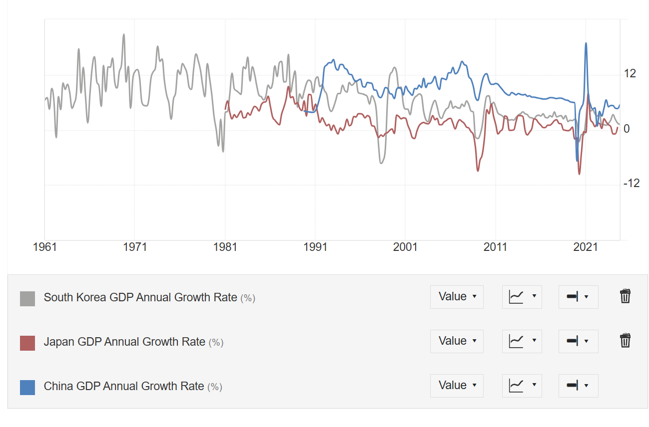 이건 일본/한국/중국이 고도성장기에 15% 이상의 성장을 보이다가 어느 시점 이후 성장률이 우하향하는 것과 매우 다른 구조다.