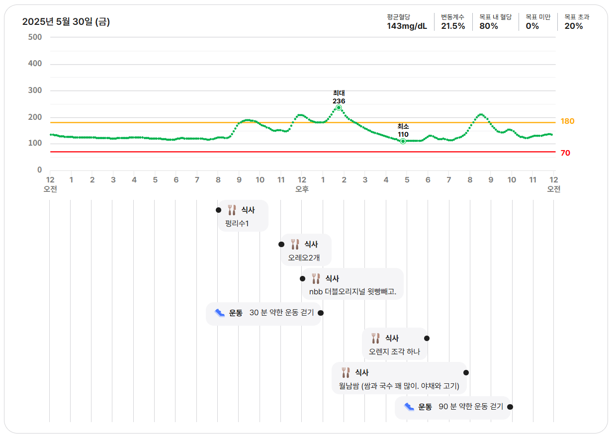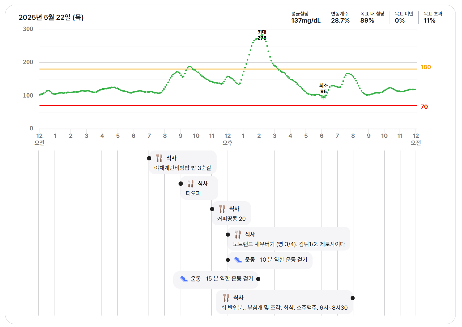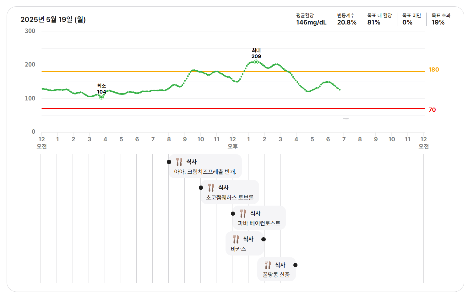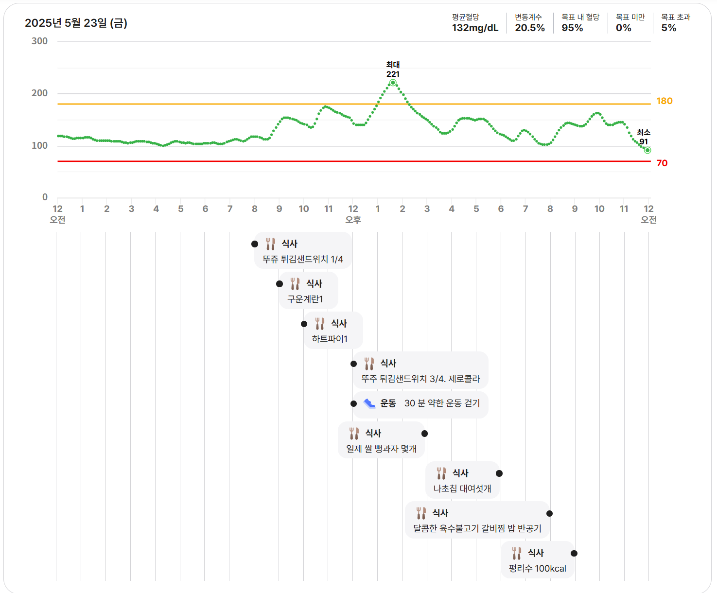 밤에 잠을 제대로 자지 못했는데 밤새 혈당도 120~150을 오르락내리락했다. (이런 적은 처음인 것 같다) 다음날 아침이 너무 피곤하고 정신이 들지 않았다
