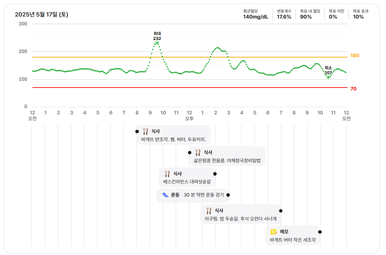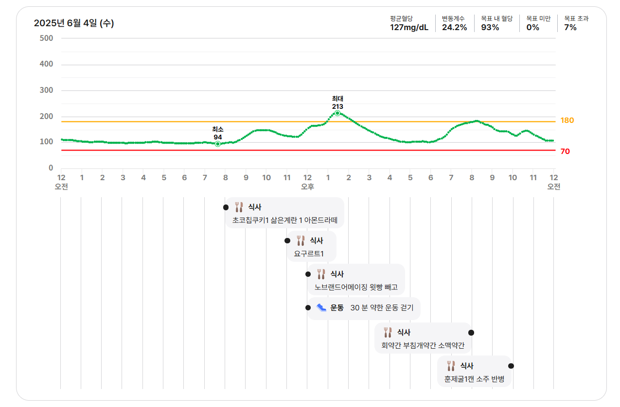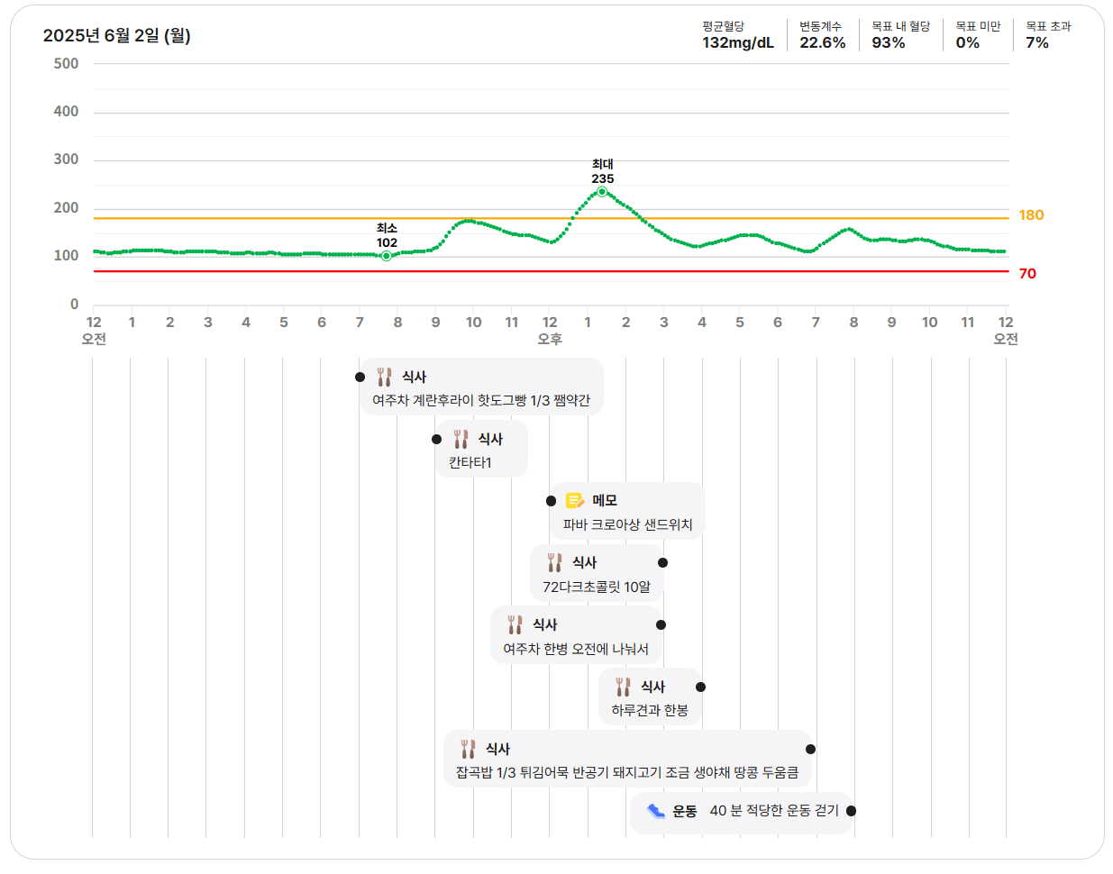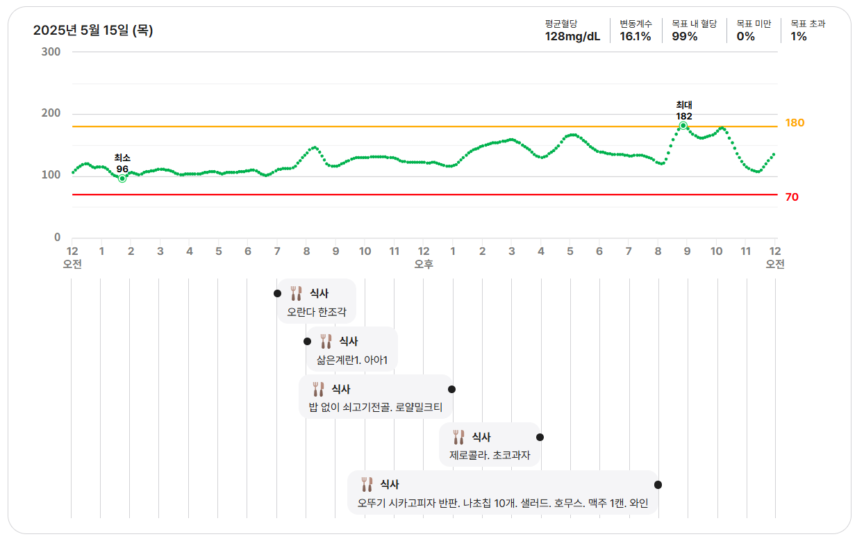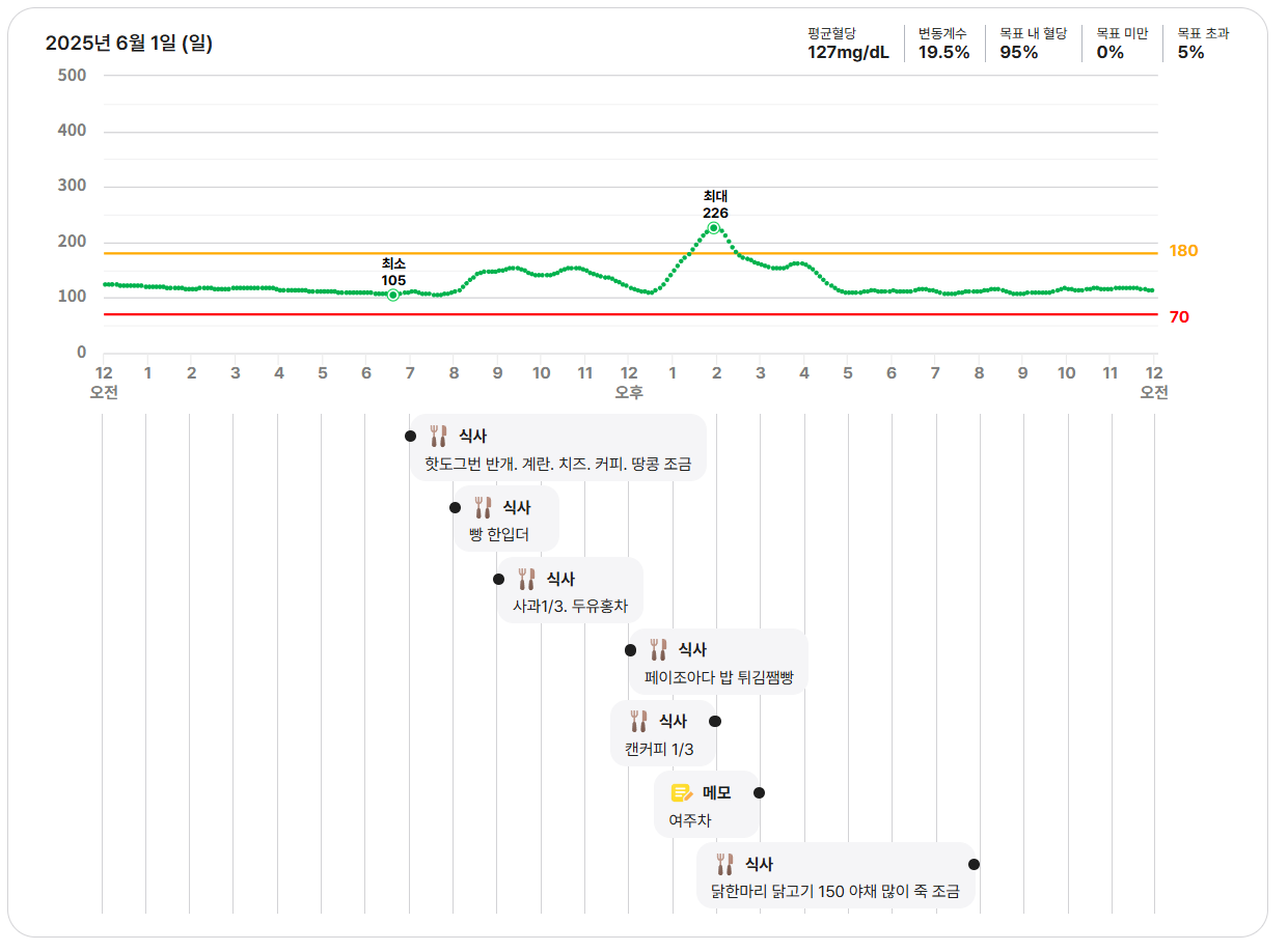 밤에 잠을 제대로 자지 못했는데 밤새 혈당도 120~150을 오르락내리락했다. (이런 적은 처음인 것 같다) 다음날 아침이 너무 피곤하고 정신이 들지 않았다