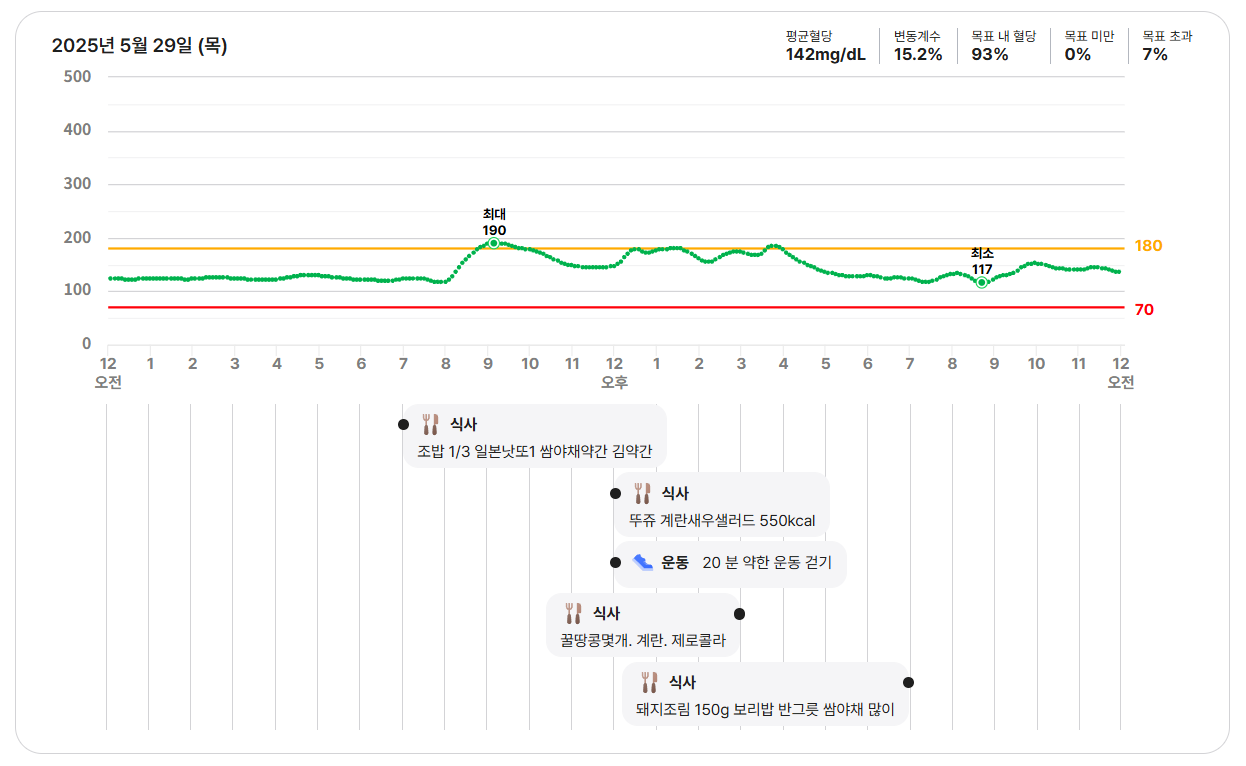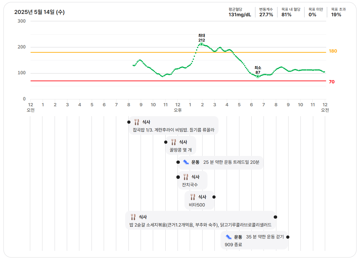 저녁에 탄수화물 섭취량이 많아, 저녁 내내 운동을 했는데도 혈당은 계속 떨어지지 않음